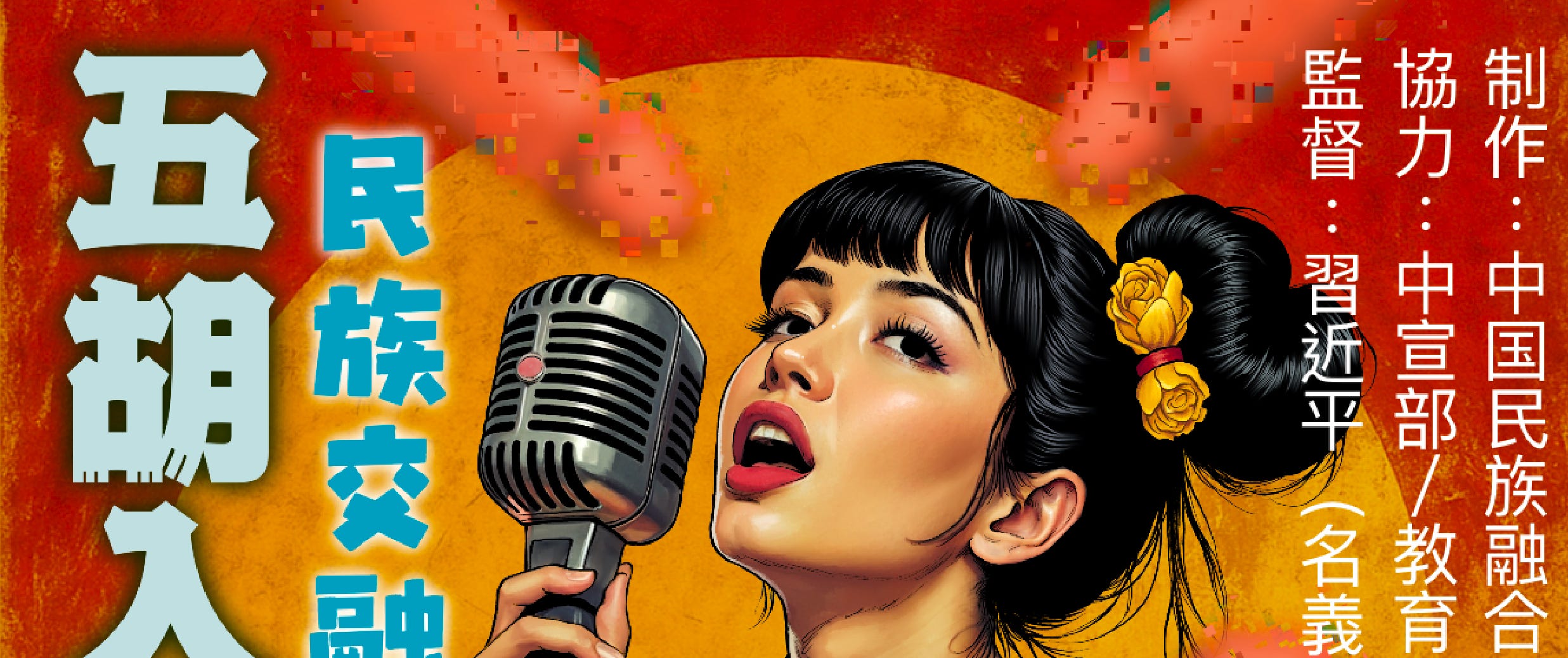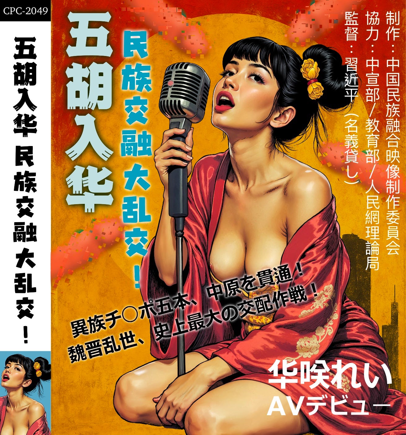 所以我决定照着他们的逻辑画一张封面——以日式情色片的形式,忠实再现这段宣传语的视觉隐喻。画面里的女主角手握麦克风,她在“为中华民族共同体发声”,也在“接受五胡的入华”。这张封面并不需要我加注太多立场,它只是帮忙把宣传语的画面感,具体地画了出来。