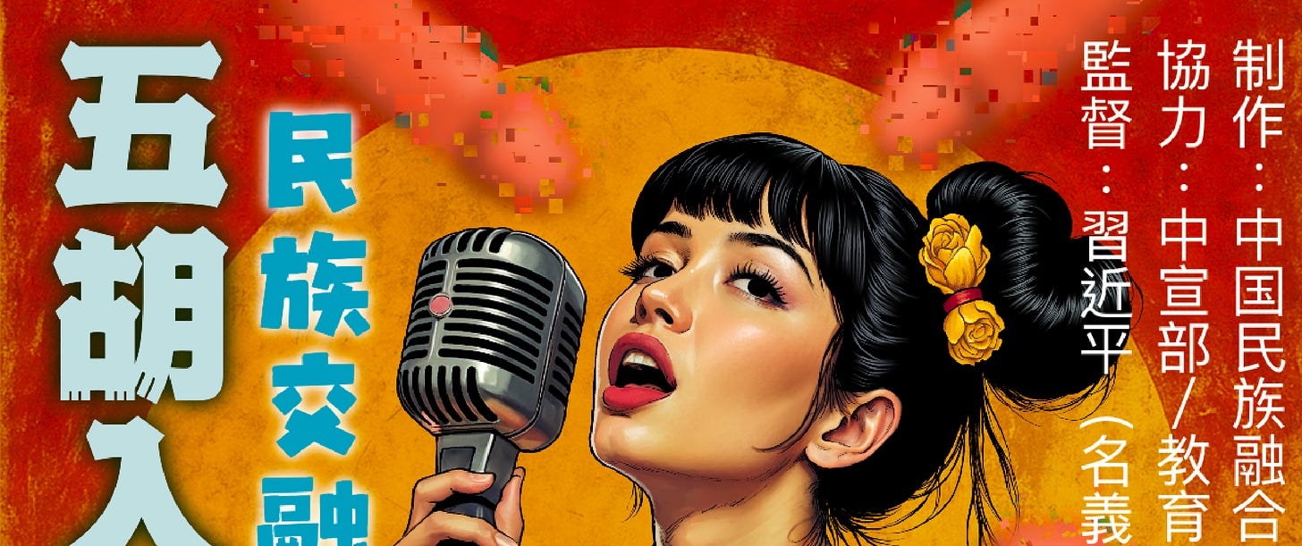 请注意这几个词——“五胡入华”、“民族交融”、“共同体”。它们连在一起的时候,你很难不想到一出强制发声的情色大戏:五支话筒围着一个人,轮番上阵,她不只是发声,还得发自内心地高潮式发声。