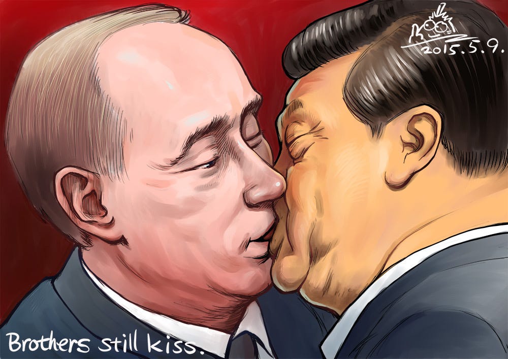 十年一吻中俄梦红场二度重逢,独裁兄弟深情续集Rebel Pepper's CartoonsMay 08, 20251Share2015年5月9日,习近平赴莫斯科参加胜利日阅兵,成为西方领导人缺席下红场上最显眼的“贵宾”。那一天,我画下这幅讽刺漫画《Brothers still kiss》,调侃他与普京之间扭曲而尴尬的“兄弟情”。十年过去,今天是2025年5月9日,历史惊人重演:习近平又一次现身莫斯科,再度与普京深情“合体”。而这一次,普京成了战犯,习近平依旧亲自赴约,成为红场上最显眼的“老朋友”。